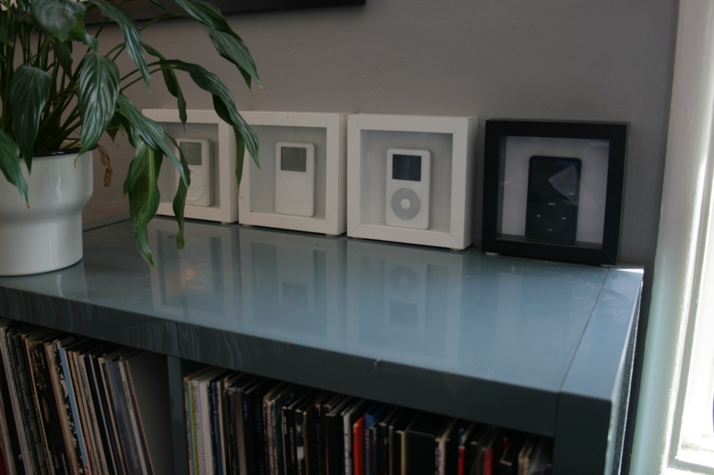 IKEA RIBBA frames display our collection of defunct iPods, going back to gen 2